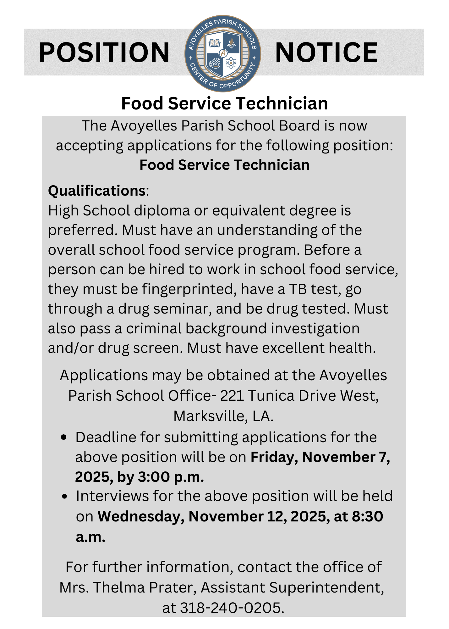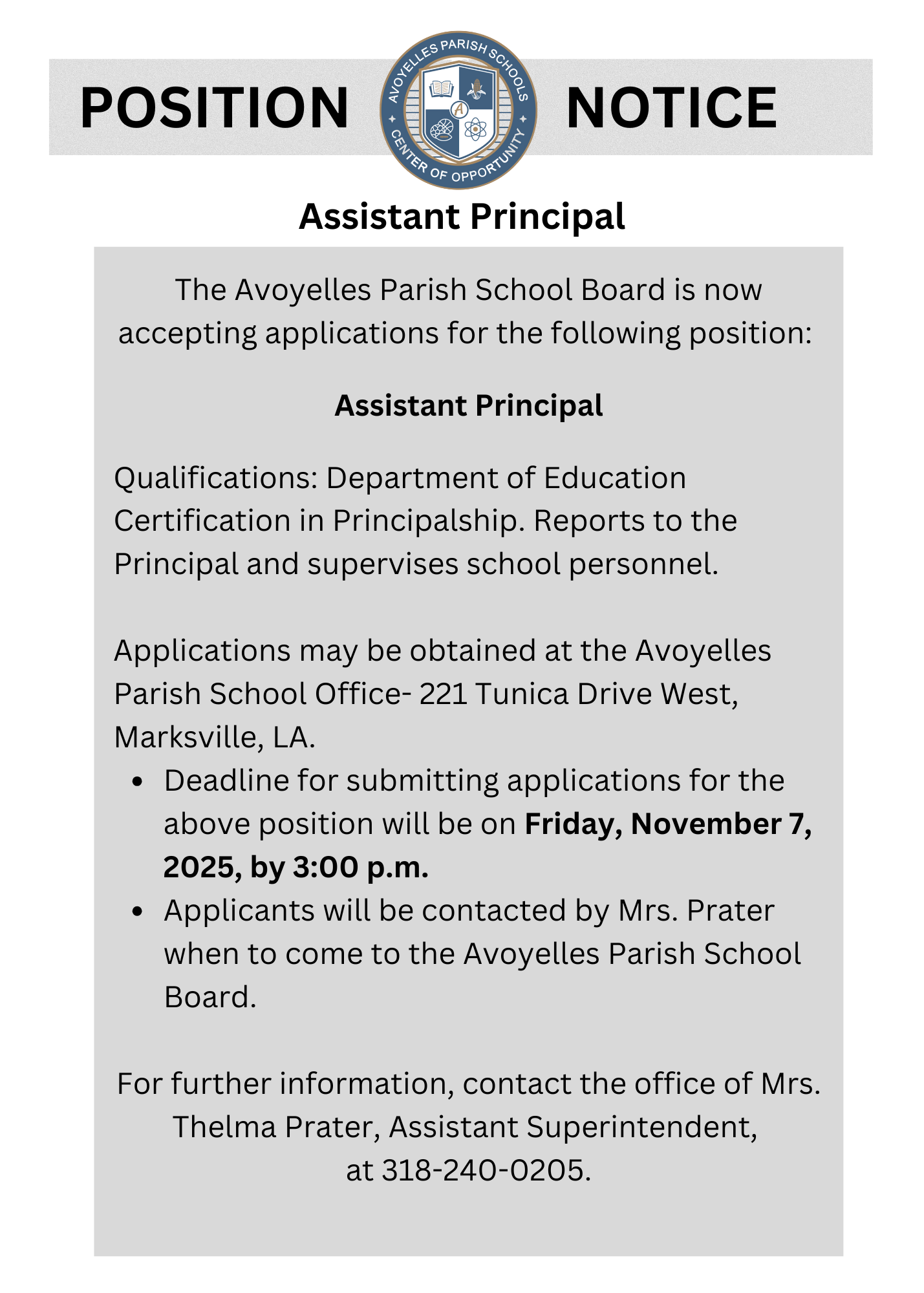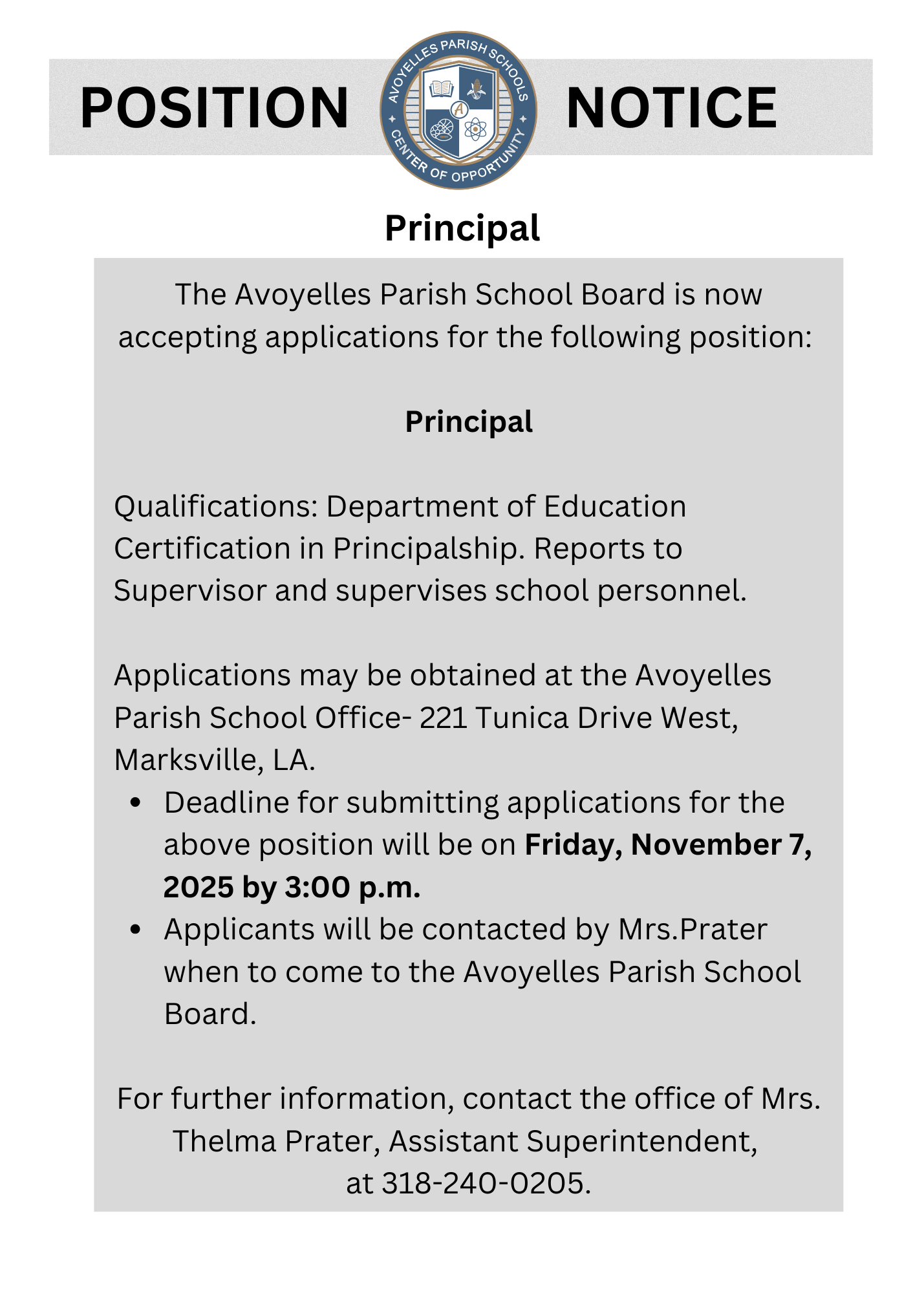 For application and Information:  Call Assistant Superintendent Thelma Prater at 318-240-0205.