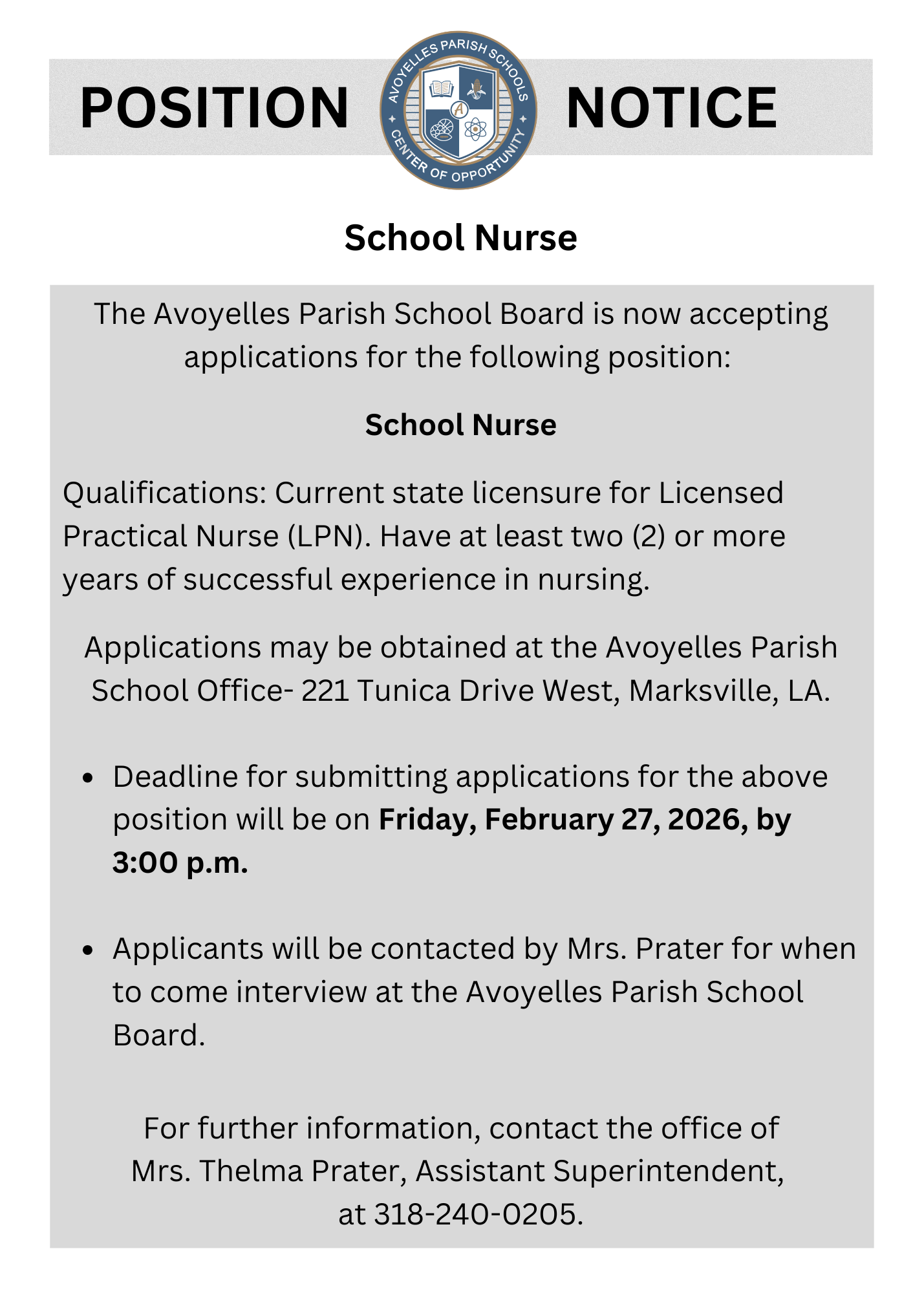 The Avoyelles Parish School Board is now accepting applications for the following position: School Nurse